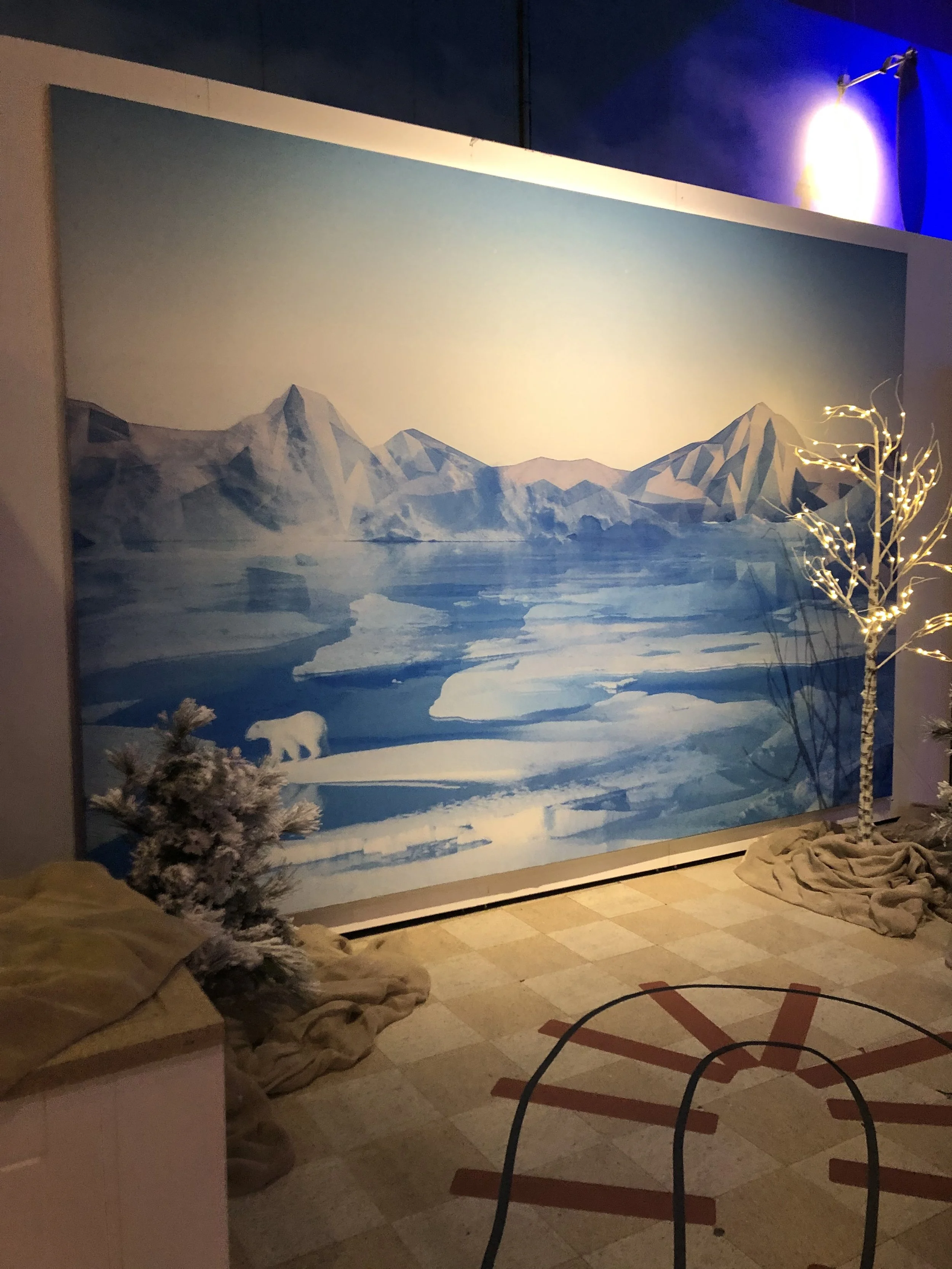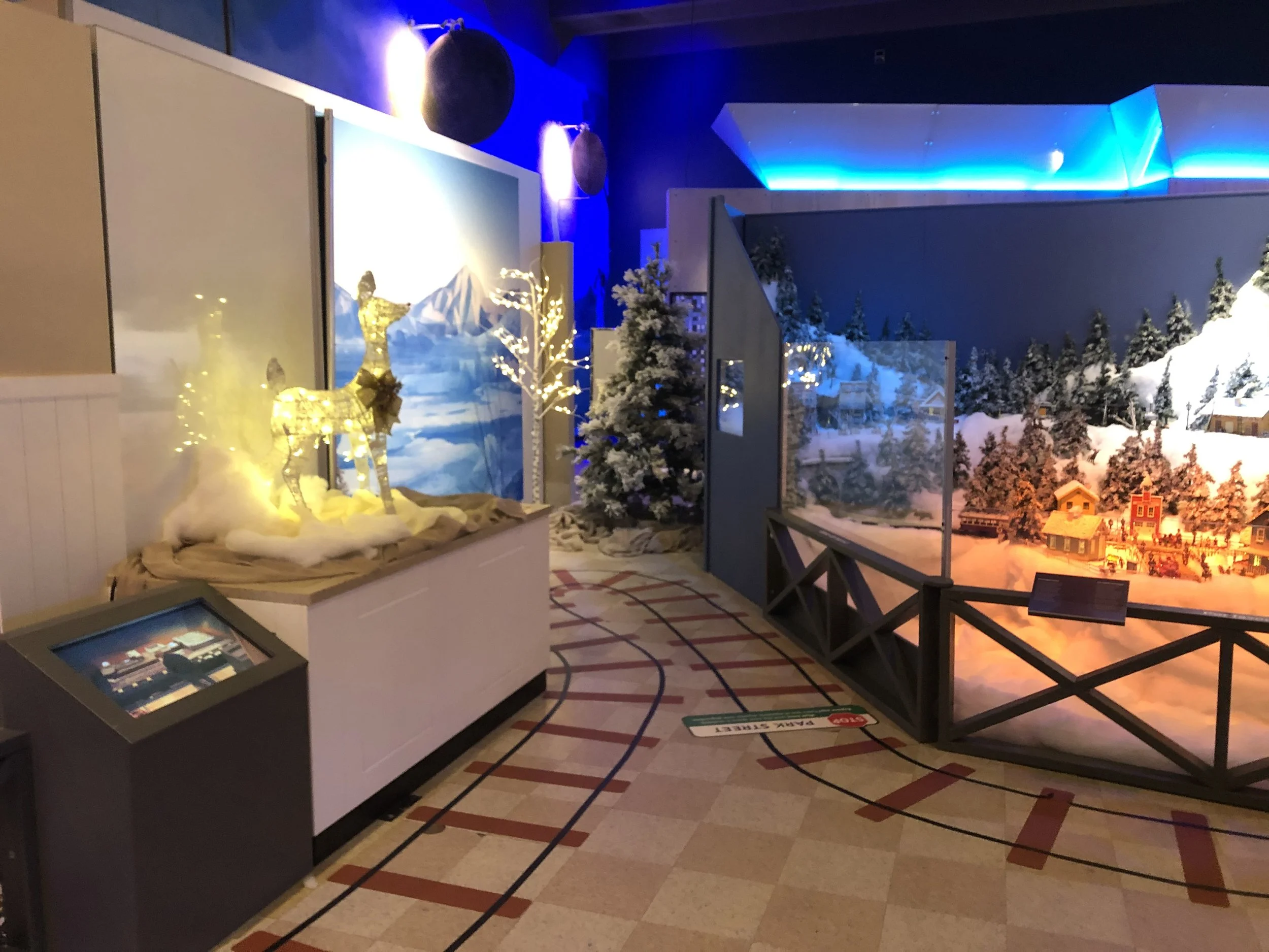 When this annual exhibit opened for the first time in 2018, we made a photo-op, toy train tables, and a large 3-tiered train island. For the third iteration in 2020, we had to create a one-way exhibit, which we achieved with train track floor graphics with stops every 6 feet for families to stop at to ensure social distancing during Covid. We also spread out the train island into 4 sections to elongate the experience.