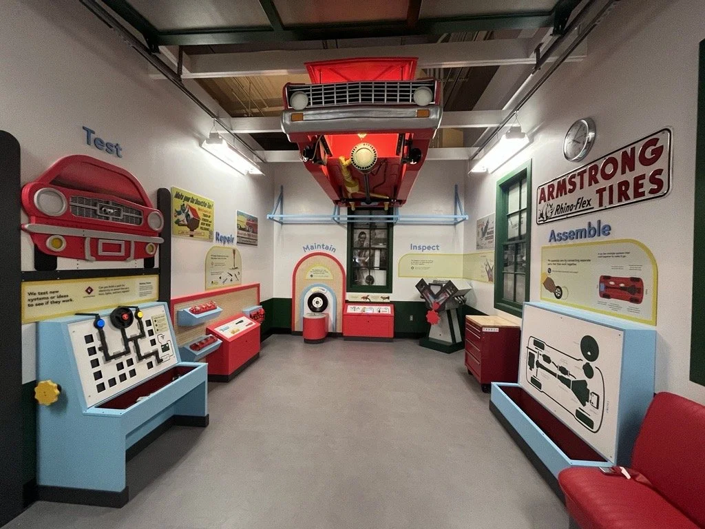 The Henry Ford Museum is known for its large and unusual artifacts that hallmark Americana. This Texaco Station is one such artifact at the museum- the entire station from the 1950s has been relocated to the museum and the office portion of the artifact remains a human scale diorama for visitors to view. However, the garage side of the artifact has been reimagined as a space for young learners to engage in immersive pretend play and learn about car parts and car repair.